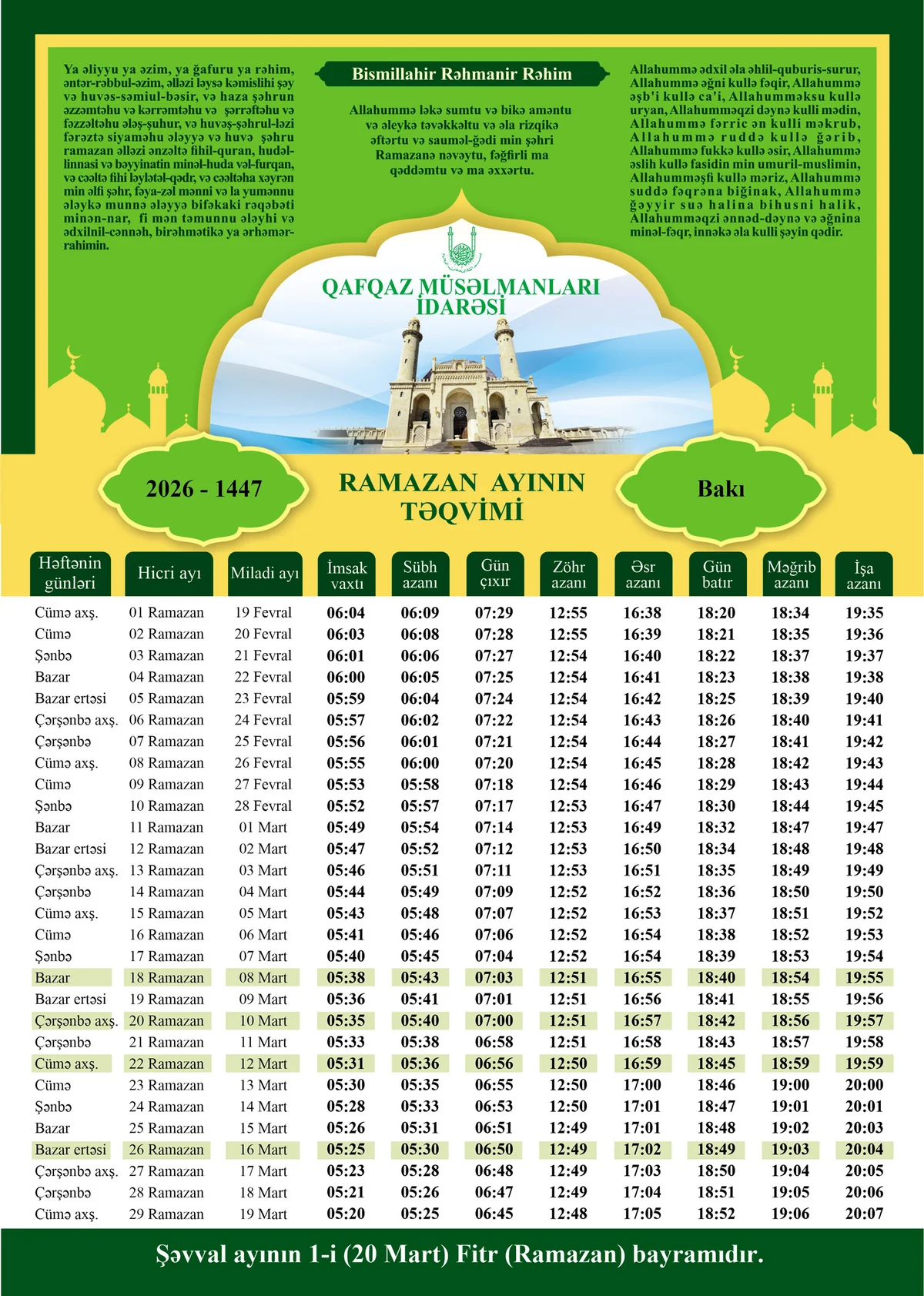 Fətvada bildirilib ki, Ramazan bayramının tarixi Şəvval ayının hilalının görünməsindən asılı olaraq, böyük ehtimalla 20 marta təsadüf edəcək: