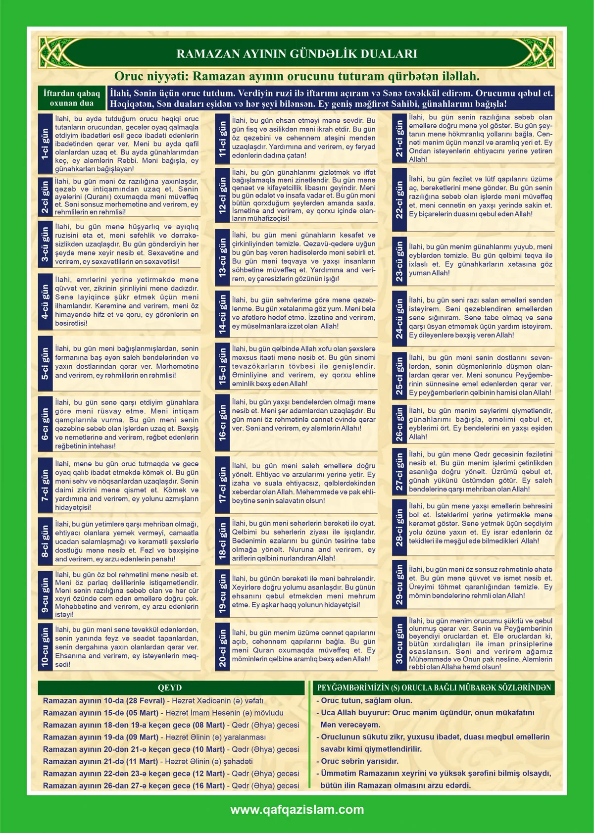 Bundan başqa, Ramazan ayının gündəlik duaları, imsak-iftar vaxtlarını əks etdirən xüsusi təqvimə əsasən, ilk Qədr (Əhya) gecəsi martın 8-i, digərləri isə martın 10-u, 12-si və 16-sı olacaq.