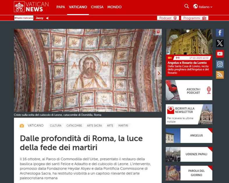 Müqəddəs Taxt-Tacın informasiya resursları Azərbaycanın Birinci vitse-prezidenti Mehriban Əliyevanın iştirakı ilə oktyabrın 16-da Müqəddəs Kommodilla katakombalarının bərpası layihəsinin açılışını diqqətdə saxlayıb.
