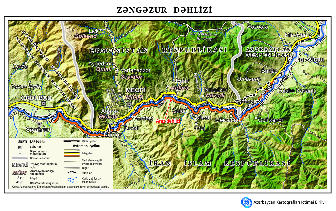 “Azərbaycan Kartoqrafları” İctimai Birliyi Zəngəzur dəhlizinin xəritəsini hazırlayıb. Xəritənin altlığı yüksək keyfiyyətli kosmik şəkillər əsasında tərtib edilib”.